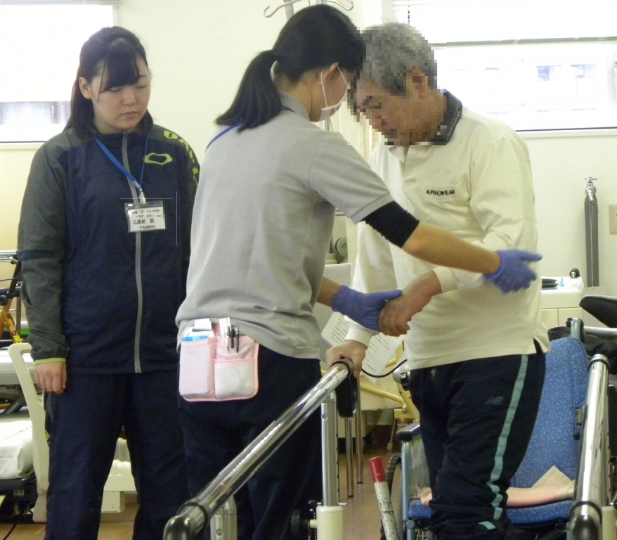 リハビリ体験の高校生も職員とペアで患者さんのリハビリに付き添います。