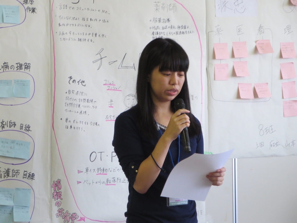 患者さんの退院に向けて、どんな職種が関わり、目標や課題を考え、グループごとに模造紙にまとめていきました。