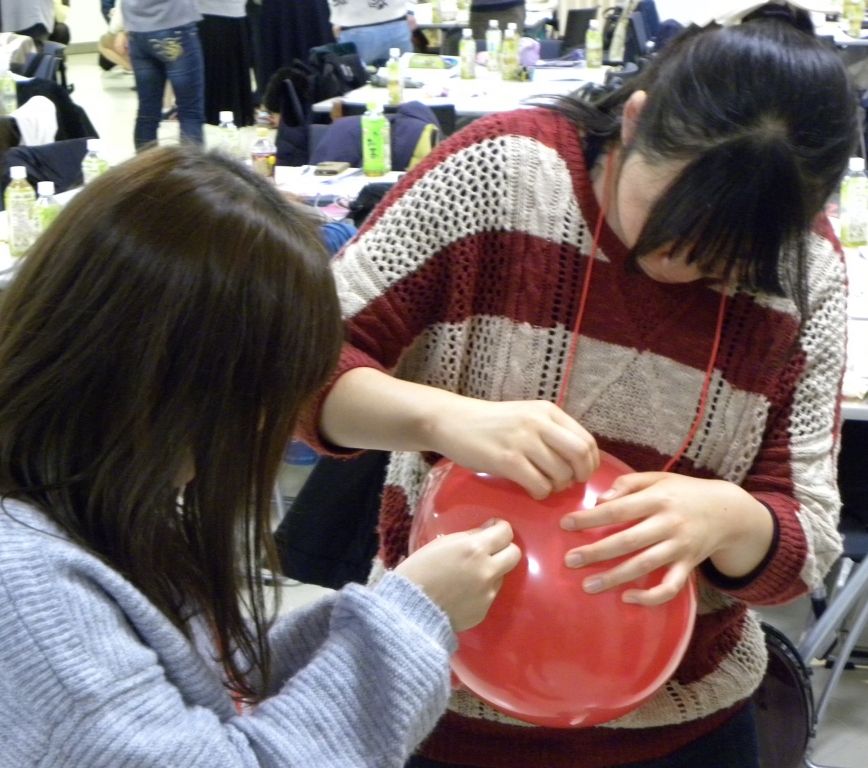 風船シール剥がしゲームではみんなドキドキしながら熱いバトルを展開。
