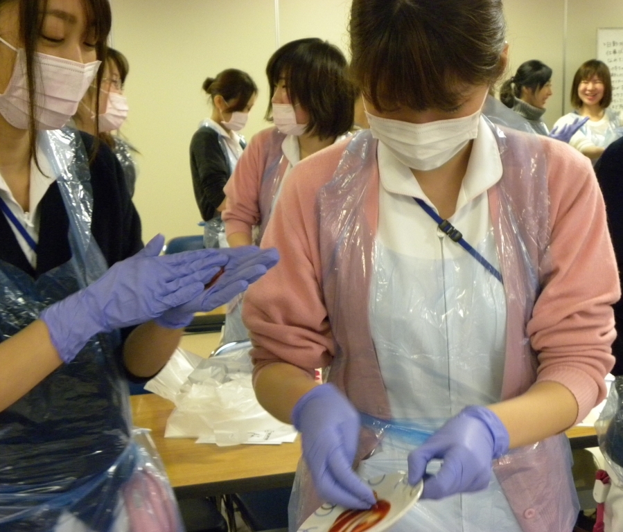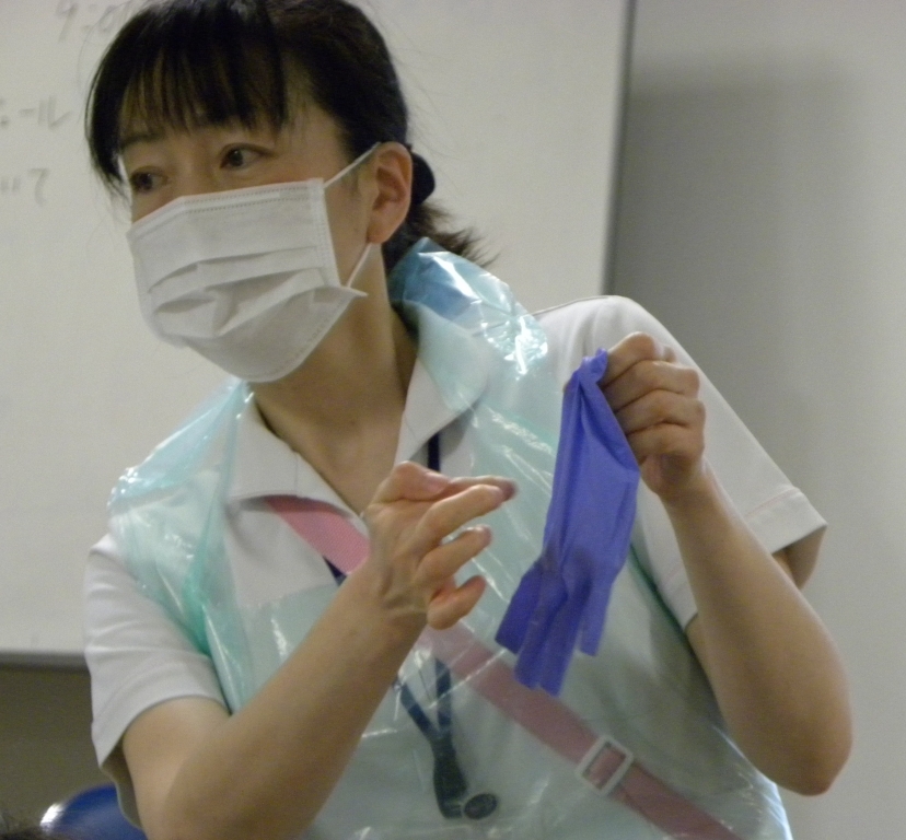 実際に手にケチャップをつけて病原体による感染から身を守る(自分自身も、患者さんも)防護具の着脱練習を行いました。