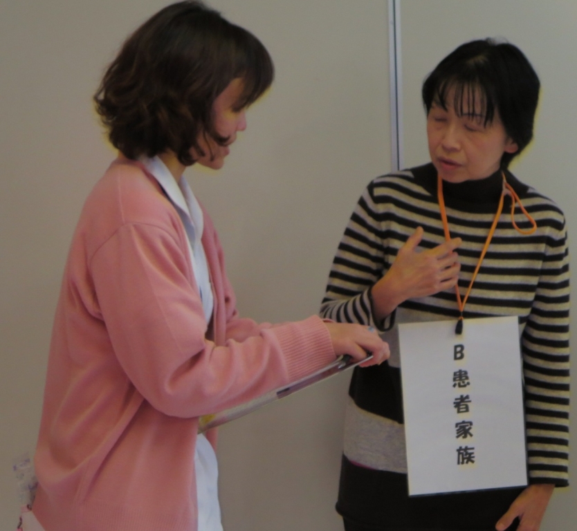 グループメンバーで新人看護師役・内視鏡看護師役・患者家族A役を決め、先輩看護師が患者家族B役・リーダー看護師役を演じます。
