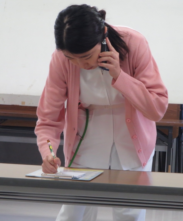 午後は「多重課題(接遇編)」。3人1組でシミュレーション研修の配役を決めて実施しました。