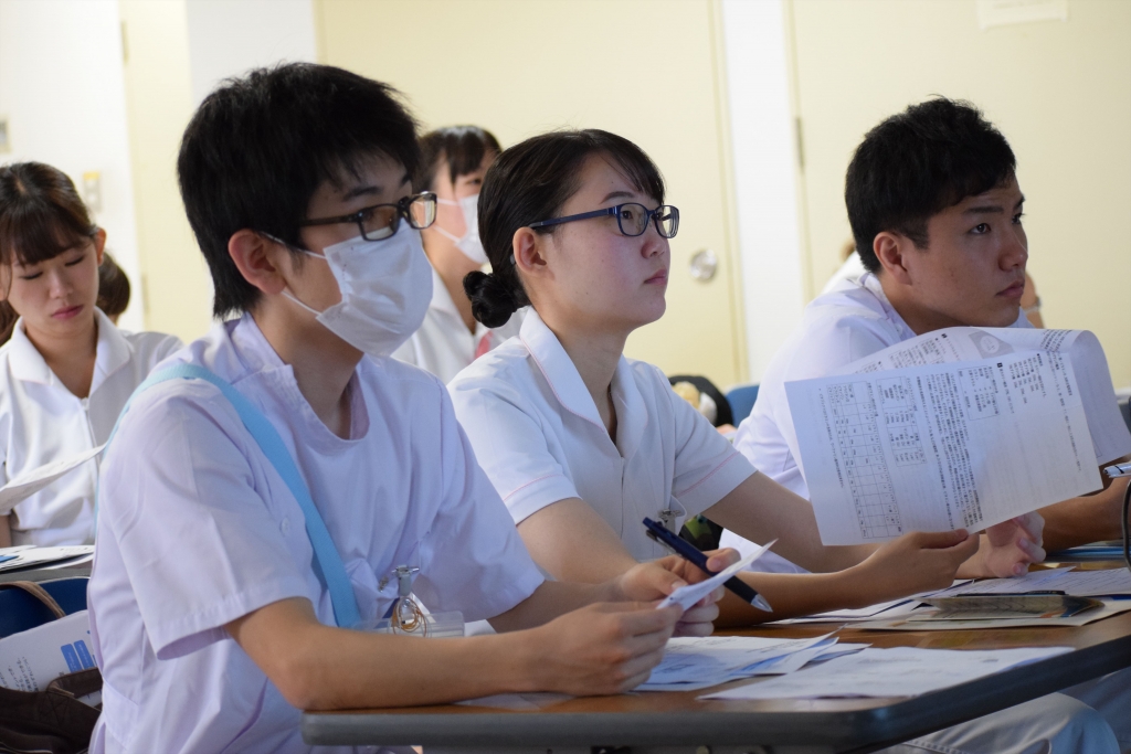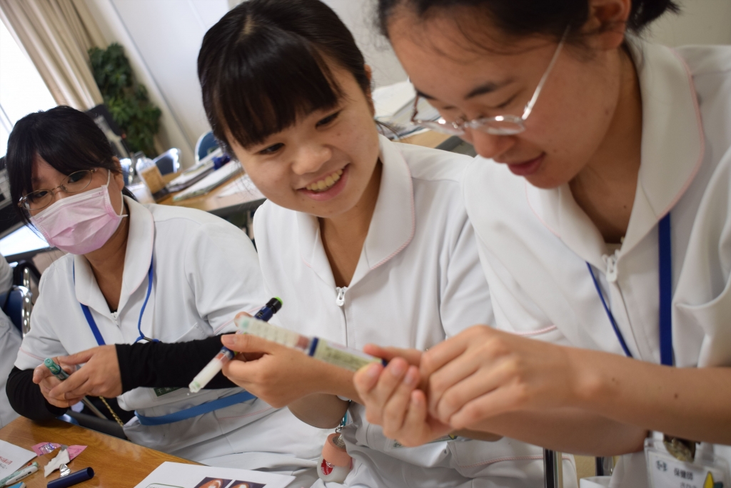5月25日、二和病院で卒後1年目研修を行いました。今回のテーマは「与薬の技術」。二和病院の薬剤師から与薬の方法、処方箋の書き方、麻薬や向精神薬の扱い方からはじまり、輸液の管理方法、血液製剤の取り扱いなどの講義を受けます。看護師からはインスリン注射の実際として、輸液の詰め方、注射の方法など実技を交えながら研修を行いました。