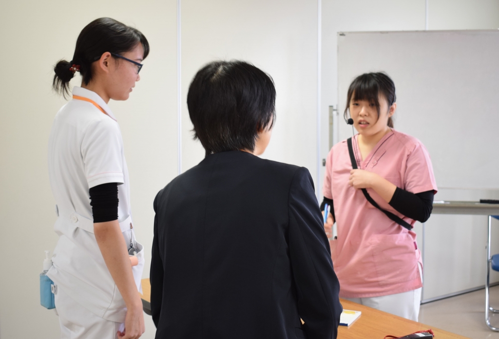 県連の卒後1年目研修として、今回は〝多重課題 接遇〟のシュミレーション研修を行いました。1グループ2~3名で看護師役、患者・家族役に扮します。医師や家族への対応などさまざまな問い合せがが重なってしまうことなどはよくあることです。そこでどのように対応することが望ましいのかを学びます。実際を想定したシュミレーションを行い、それをビデオで撮影して客観的に振り返ります。他のメンバーから意見をもらうことで、今後の課題を見い出すことにつながります。緊張しながらも笑顔でがんばった1年目。今後の業務に活かしていきます。